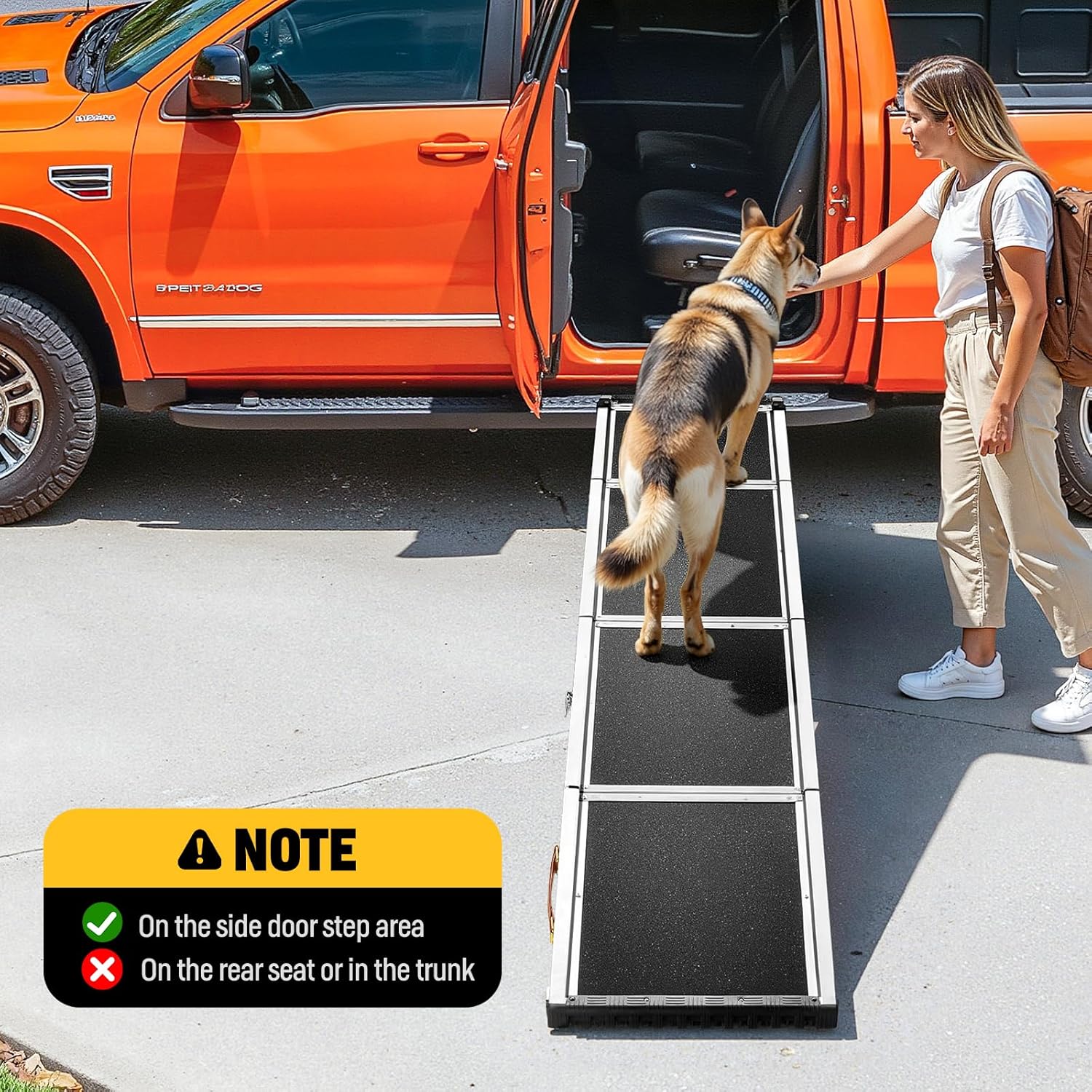• 【Supports Up to 200 lbs & Aircraft-grade Aluminum】: Our portable dog ramp for car can support up to 200 lbs, its sturdy frame crafted from aircraft-grade aluminum and solid wood. It’s designed for maximum stability and is rust and corrosion-resistant, ensuring long-lasting durability. The pet ramp also features strong steel hinges for folding, which are built to last, and it’s super easy to cleanβ€”just rinse with water.