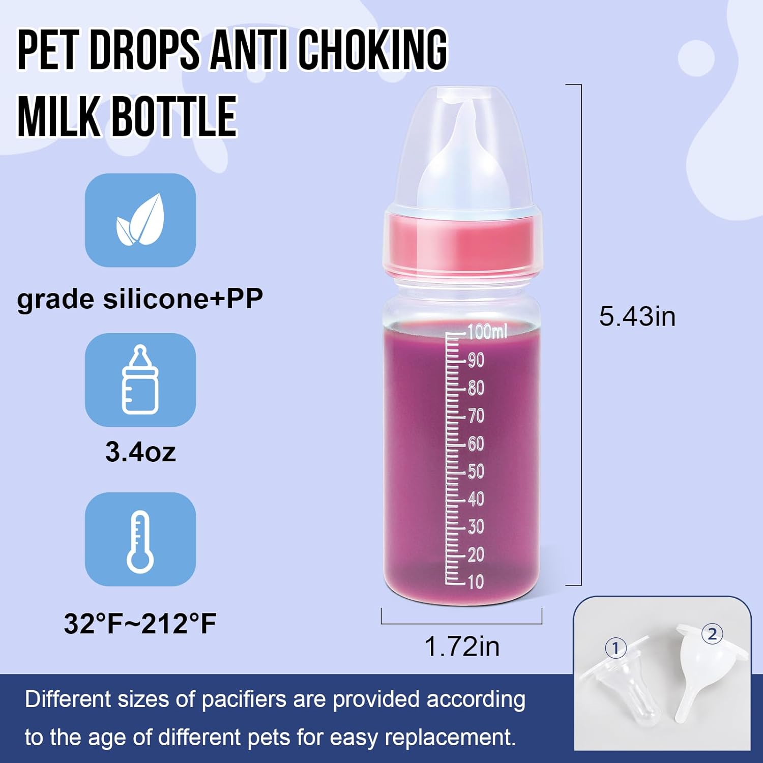 - 2 Styles Nipples: Small/Large size meet different newborn pet feeding needs, designed by a professional veterinarian, mimics the shape of a pet mother’s pacifier, made of food grade silicone, soft and safe, resistant to tearing and biting, all nursing nipples are pre-made 1mm small hole, do not need to cut the nipple.