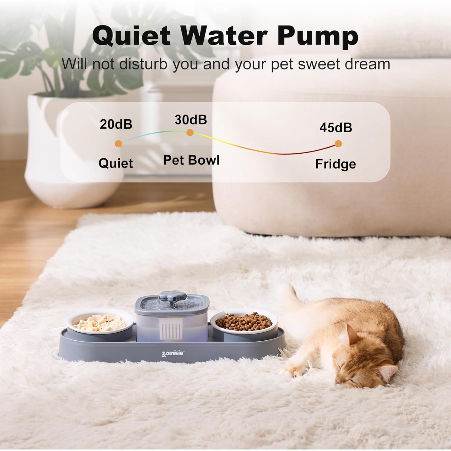 The ZOMISIA fountain offers a continuous, whisper‑quiet stream that entices even shy kittens to drink more. The two ceramic bowls attach securely, simplifying feeding stations and saving space and looks great. Easy to disassemble and clean. At its price point, the combo provides excellent durability and cost‑effectiveness, matching the product description perfectly.