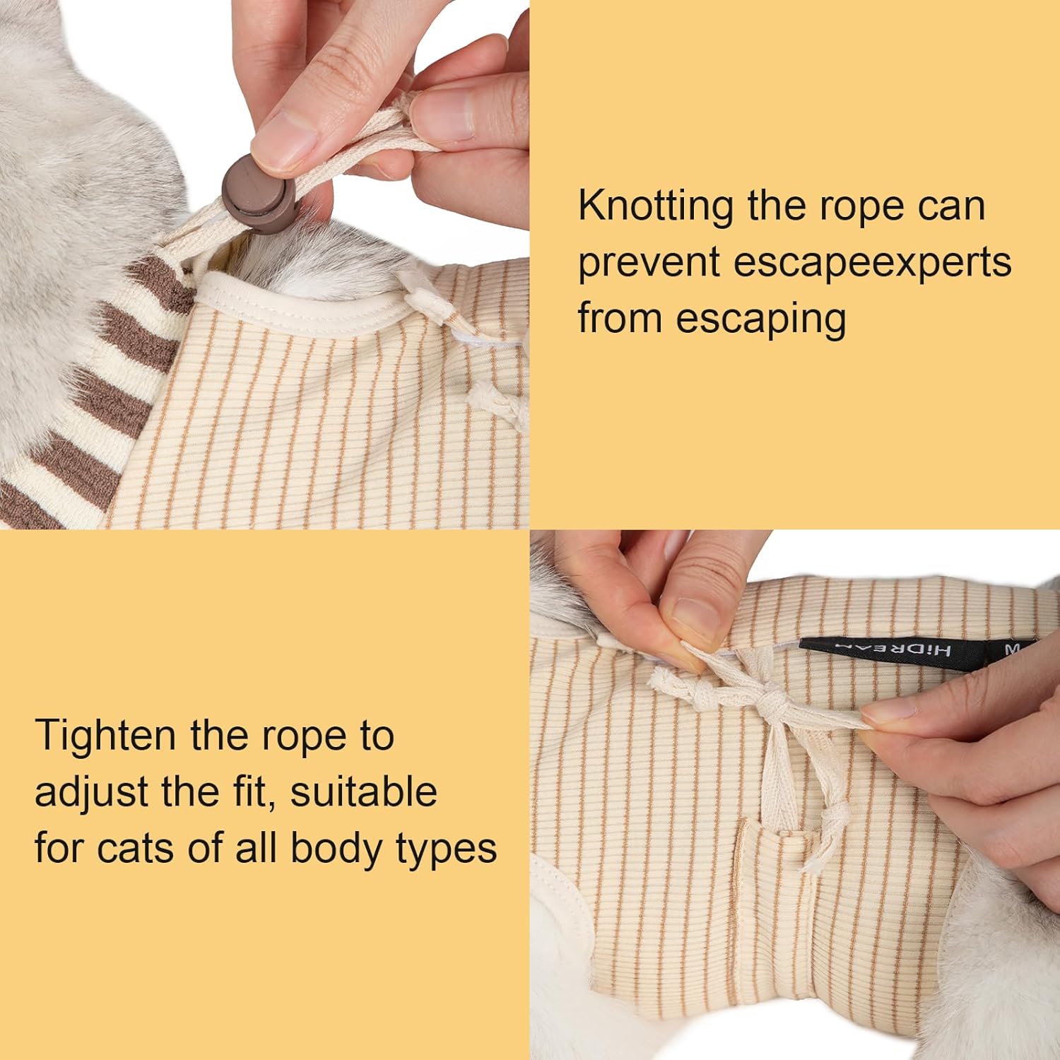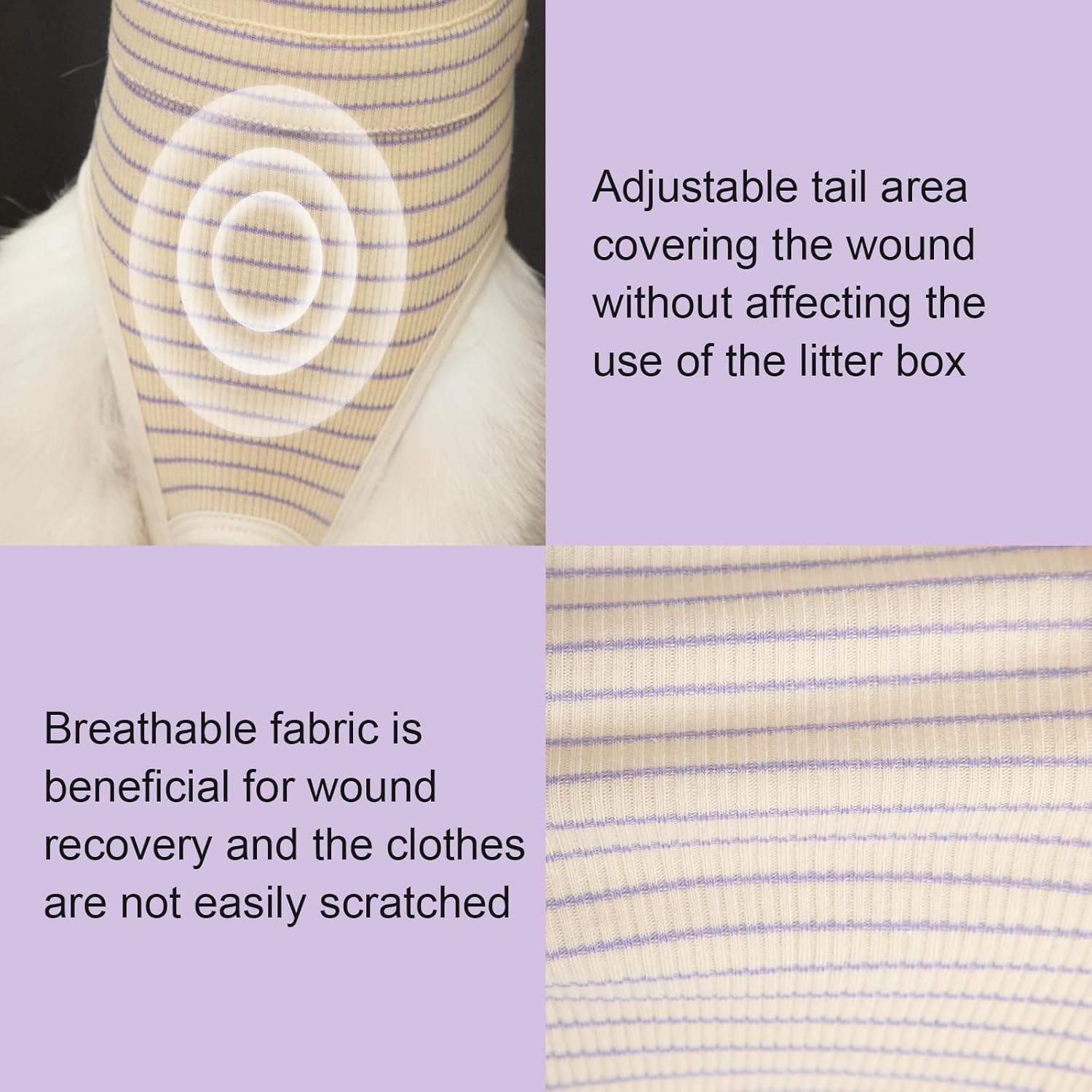 - A COMFORTABLE AND CLOSE FITTING CAT RECOVERY SUIT that is not easy to break free. The neck is made of a non elastic rope, which is not easy to break or sag after knotting. The tail is designed with a thin rope opening to reduce discomfort for cats, making it convenient and practical for cat litter boxes. The neck, waist, and length of the garment can be adjusted for a more snug fit, suitable for all types of cats.