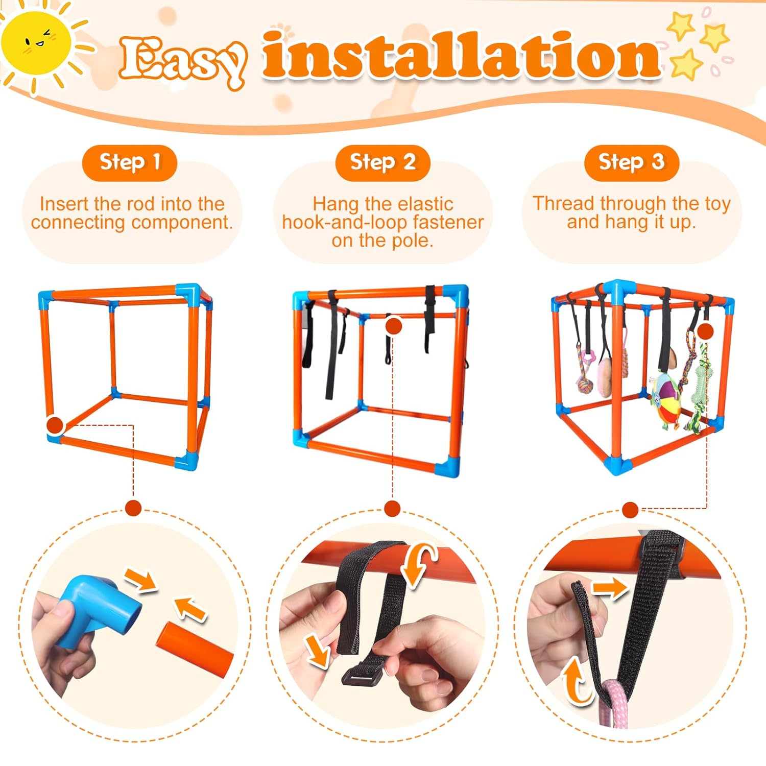 Very easy to assemble the frame and hang the toys. It all just slides together easily, the toys hang off adjustable velcro straps. I really like some of the toys, but some, the little stuffed ones, are cheaply made and would be easy for my pup to shred, but there are heavier knotted ropes, and rubber chew toys that will hold up better.