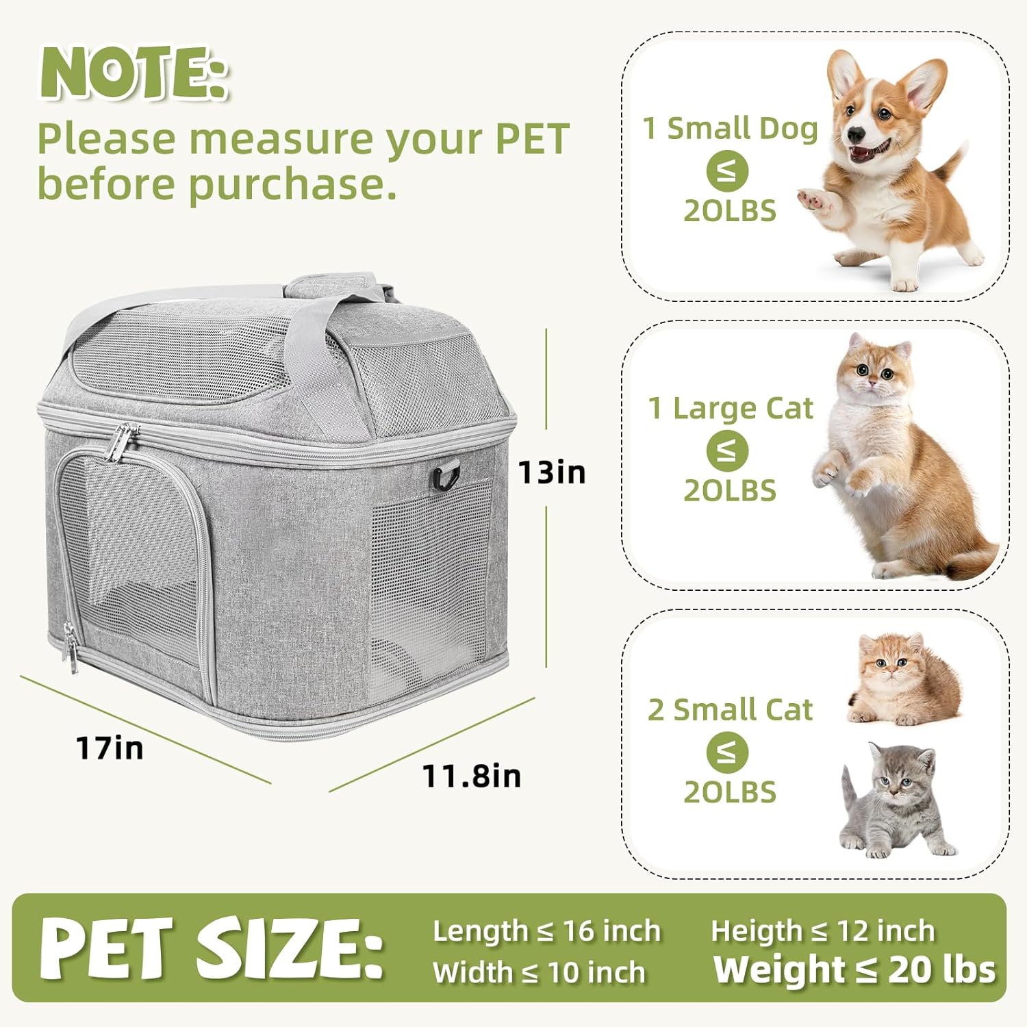 My cat in pictures is 18 lbs. As you can see in pictures the carrier bottom holds firm and rigid so nice and stable for cat. Also the bottom panel is nice, soft, and fluffy which is great, until your pet has an accident, BUT the cover has a zipper , so can unzip and wash cover. The bottom is a board with a layer of water proof sheeting (see picture). There is plenty of head room, which is one of the attractive features of this carrier. Picture of my big boy inside shows he is comfortable. When using shoulder strap definitely need to make sure you use your side to help stabilize as the carrier tends to want to lean/shift side to side. Definitely use handles to pickup and NOT shoulder strap. It collapses easily to store (see picture). Lots of mesh so for summer lots of air can circulate. There are metal and plastic loops in back, not big enough the slip seat belt buckle thru but perhaps designed to attach to a strap system that you can get separately to attach to?? There is also a strap across back of one of zip up flaps, where a seat belt would fit through, so at least prevent from sliding forward. There are two very small mesh pockets on top that would hold car keys. There is a back and front zipper opening and the top zips open, but the top is NOT designed for drop opening, which is why I only gave 4 stars. You can place cat in via top, but if they are very squirmy they can jump out very easily and fast, so you will have to get it zipped up faster than they can jump out. You might get lucky if you place in and put top down and try and hold top closed with one hand and get it zipped up, but really depends on willingness of your fur baby. For the cost, in my opinion, I feel like you are getting a well made product for the $$.