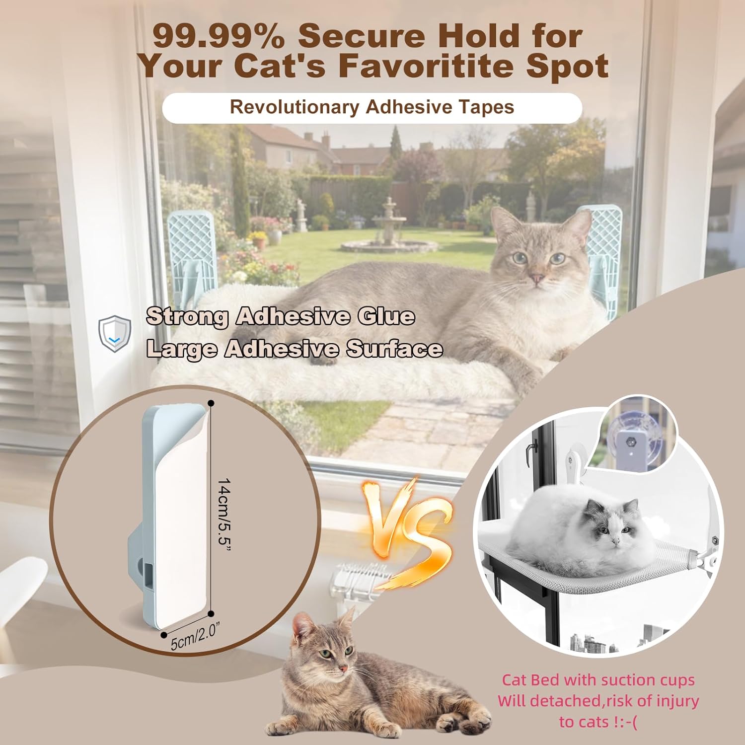 - Unmatched Safety with Strong Adhesive Strips: Our cat window perch features strong adhesive tapes instead of traditional suction cups, drastically reducing the risk of accidental falls to an astonishing 0.00001%. Say goodbye to worries and hello to peace of mind!
