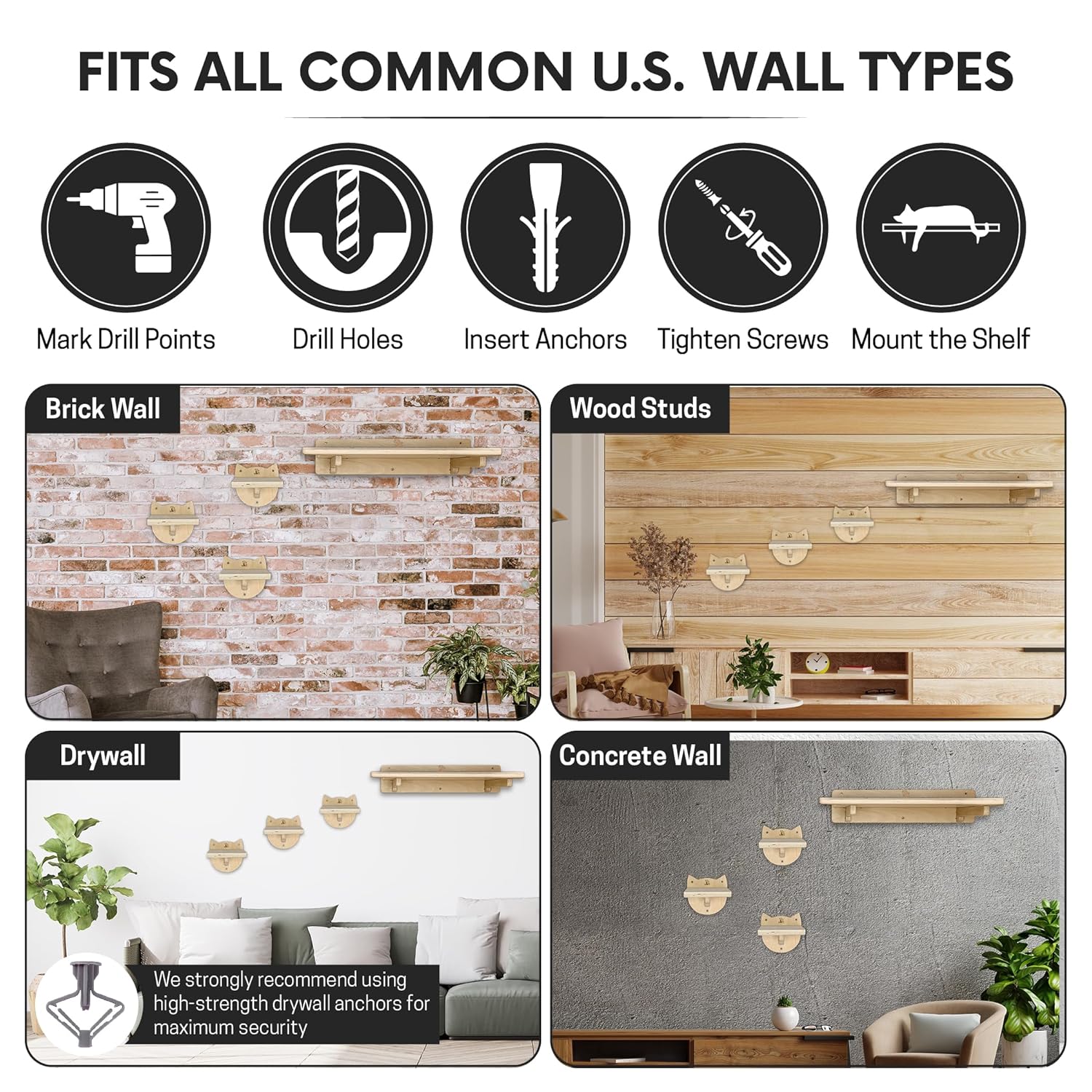 • 💪 ENGINEERED FOR HEAVY CATS (UP TO 49 LBS) – Finally, a wall solution you can trust for large breeds like Maine Coons! Our engineered design is rigorously tested to support up to 49 lbs. For a rock-solid installation, the included hardware is perfect for Solid Walls and Wood Studs. PRO-TIP FOR DRYWALL: To ensure maximum stability and peace of mind, we recommend using specialized heavy-duty drywall anchors.