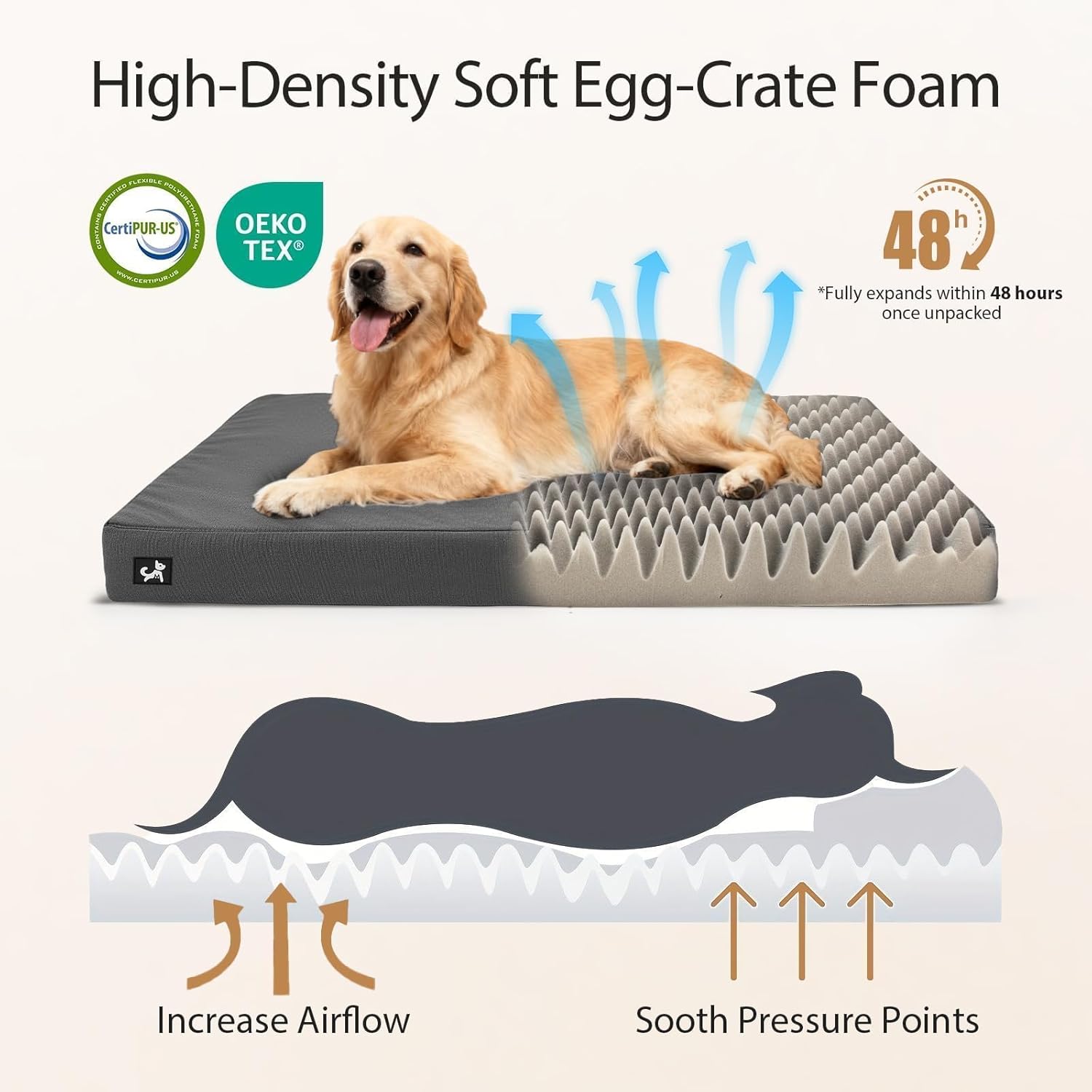 - 【Orthopedic Support】Built with a 3″ 25D high‑density egg‑crate foam core, this orthopedic dog bed delivers balanced orthopedic support with optimal pressure relief and joint cushioning. It evenly distributes your pet’s weight to reduce stress on hips, spine, and elbows for deeper, more restorative sleep.