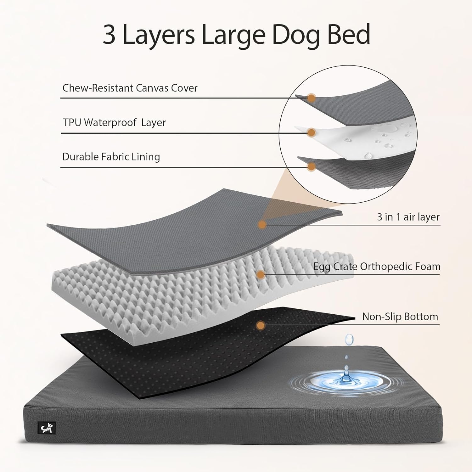 - 【Versatile & Outdoor‑Ready Dog Bed】Multi‑scene dog bed for indoor, outdoor, and car use. Fits most dog crates and kennels. Heavy‑duty 420g waterproof canvas with a non‑slip bottom. Scratch‑resistant, easy to clean, and lightweight to carry—perfect for camping, hiking, parks, and backyard use.