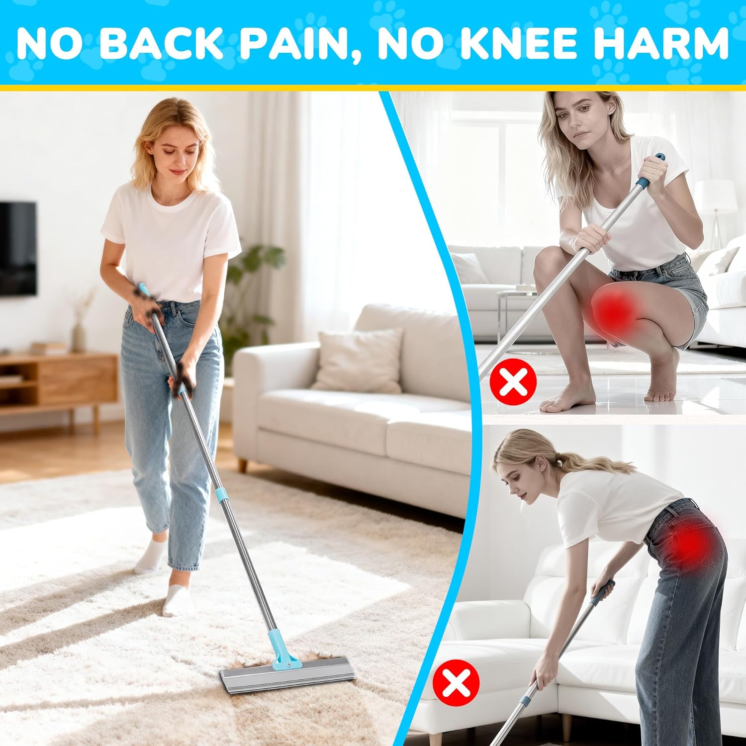 - A Perfect Gift for Pet Lovers: The pet hair carpet rake is not only practical but also makes a great gift for pet owners. Above all, it’s an ideal pick for those who cherish both a clean home and their furry friends, you don’t have to worry about handling pet or human hair anymore. You can just enjoy a lovely time with your pets. This pet hair remover is more convenient and efficient than disposable fur rollers and costly pet vacuums. It works well on almost any surface